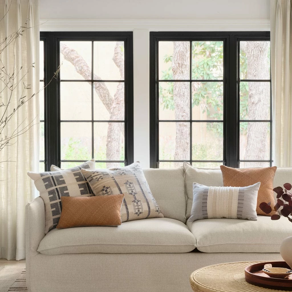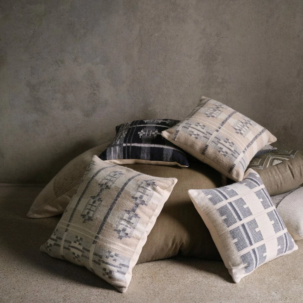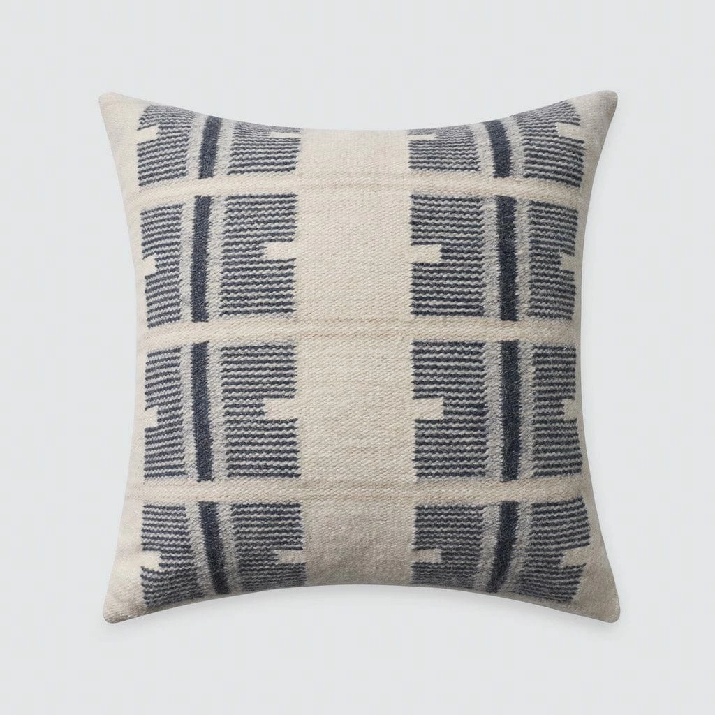 Featuring a stunning symmetrical pattern with geometric stripes, this luxe throw pillow weaves together wool and alpaca for a plush feel. Available in warm sand or cool grey, these pillows can stand alone or be styled together as a pair.