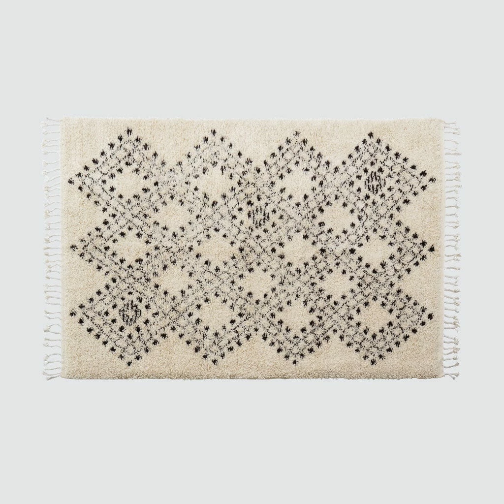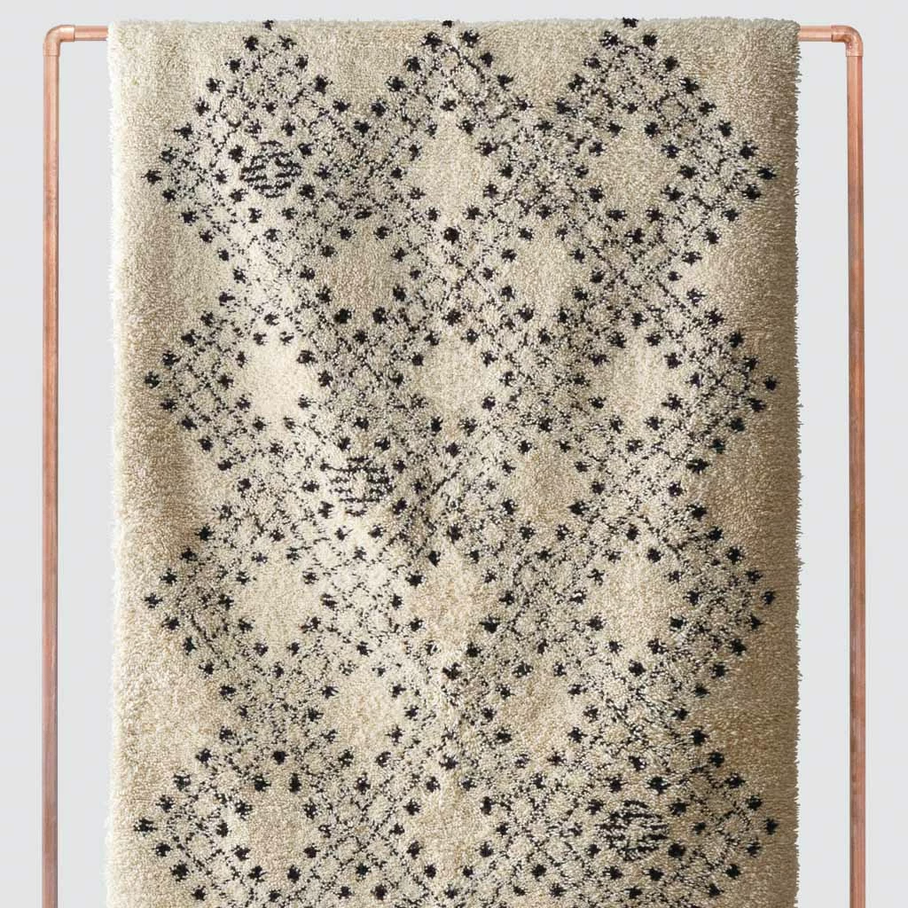 This black and cream Beni Ourain rug features traditional diamond patterns hailing from Morocco’s High Atlas mountains. Masterfully hand-knotted using extra thick, all natural sheep’s wool, this pile-knot rug is one of the softest and most luxurious rugs your feet will ever touch.