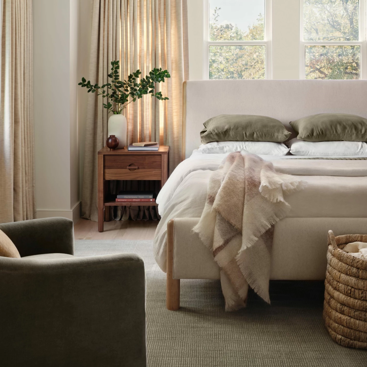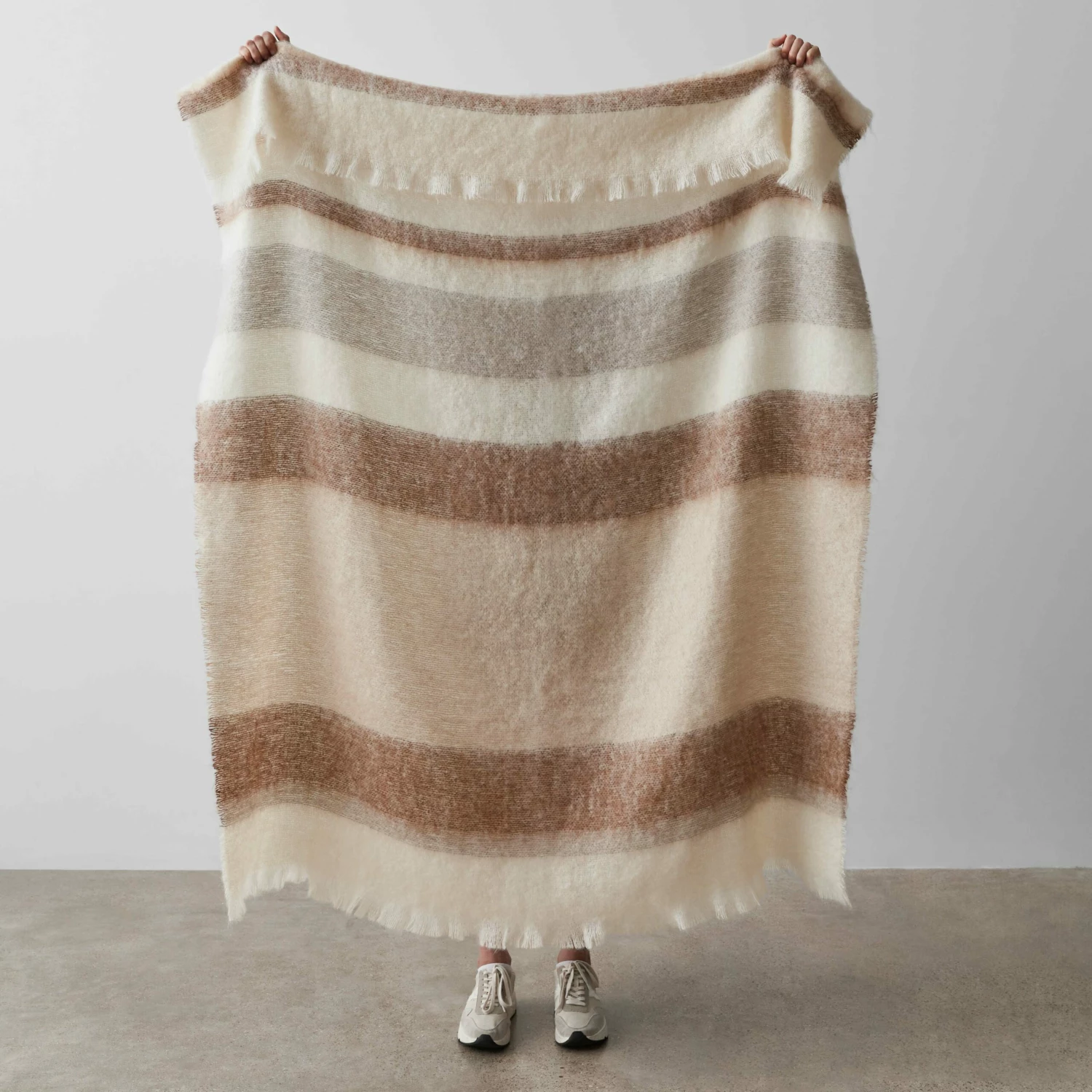 The definition of statement living, this beautiful throw is crafted from ultra-soft, hand-brushed mohair. Mixing warm and cool neutrals, every piece is accented with subtle stripes of gray and cocoa. Whether draped over a chair or the end of your bed, it’s an effortlessly cool addition to any space. When styling with your current decor, please keep in mind that the creamy shades in this piece are warmer than your typical bright white.