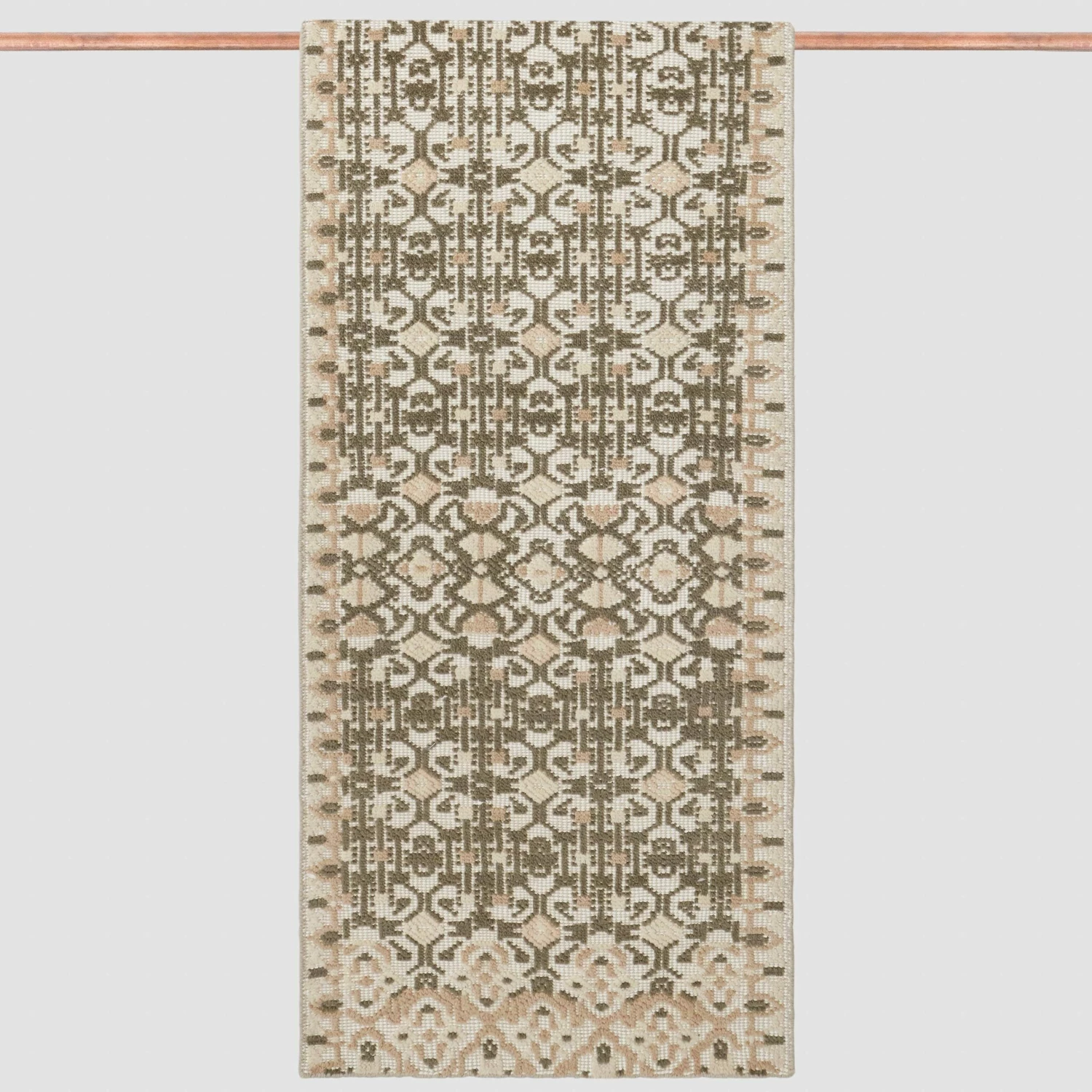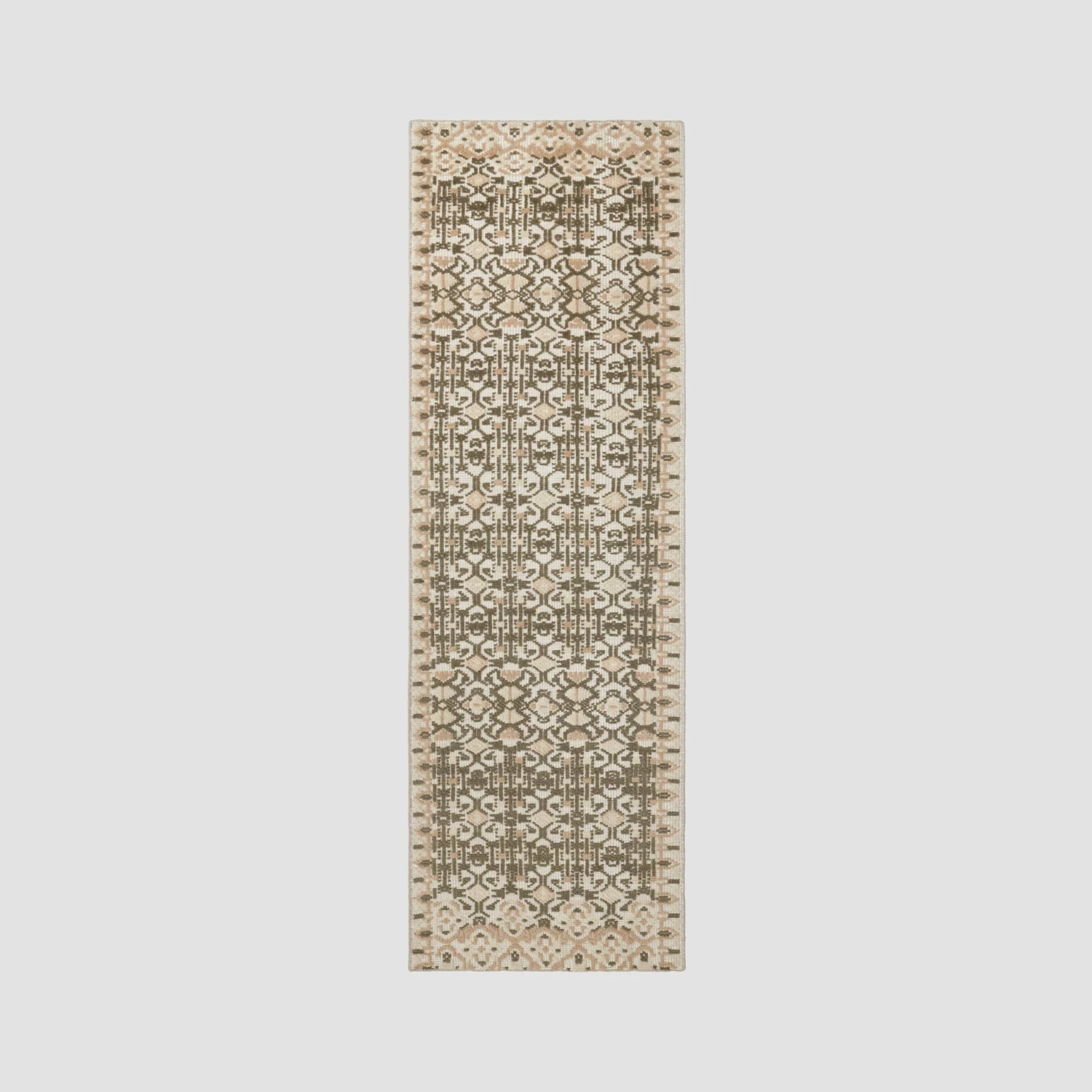 If you’ve ever strolled through a textile market in India, you’ll recognize the rich medallions and detailed repeating motifs on this hand-knotted accent rug. Set against a thriving, earthy green backdrop of wool, each piece is accented by a pair of ornamental borders on either side. Style as the final flourish for your dining or guest room.