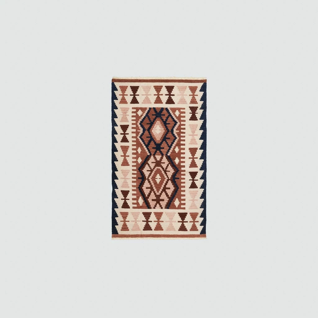 Add an artful touch to any space with this stunning handwoven kilim rug. The deep navy tones are perfectly woven in a traditional Turkish design — each done entirely by hand, so no two rugs are exactly alike. The result is a beautifully modern rug that adds depth and a well-traveled appeal to your home.