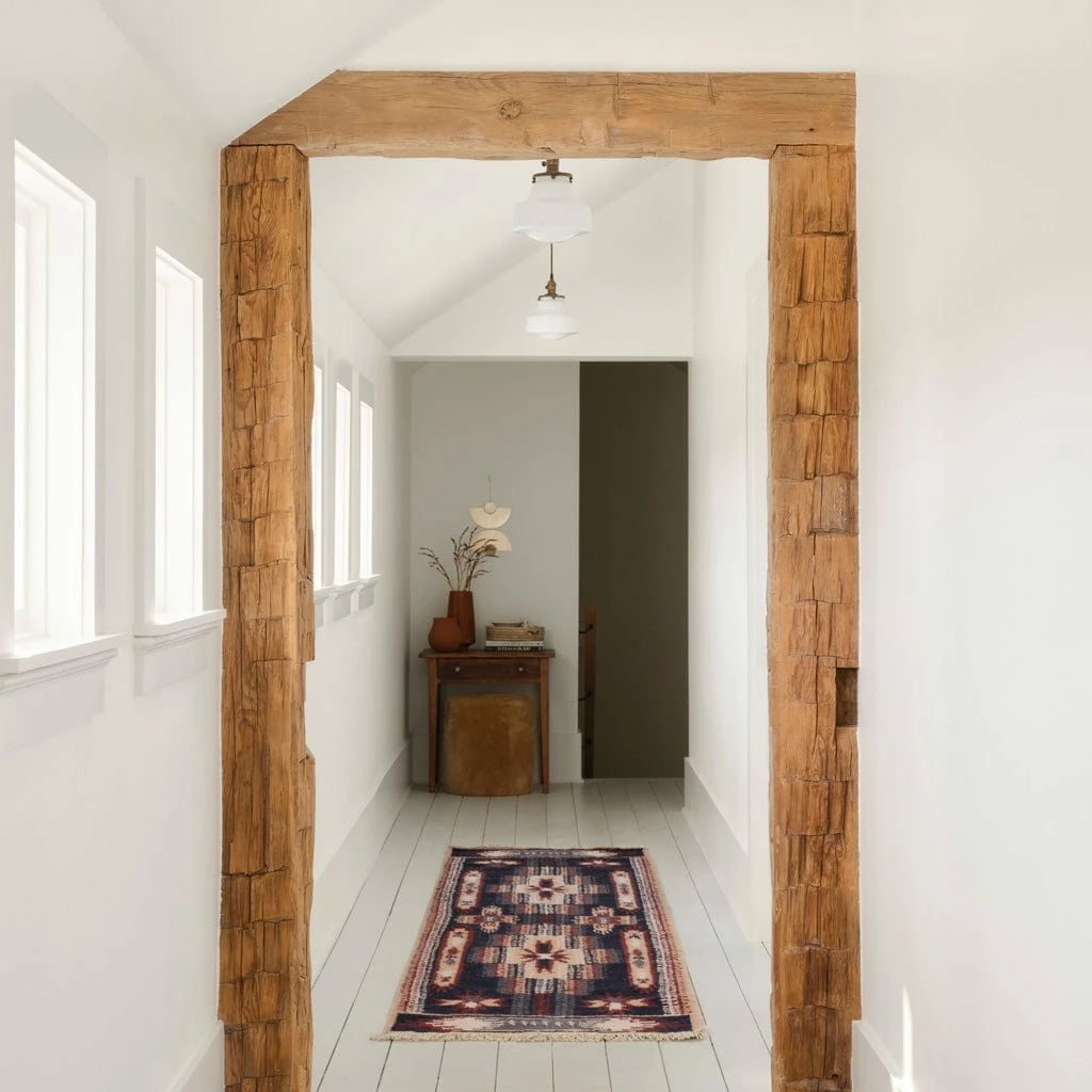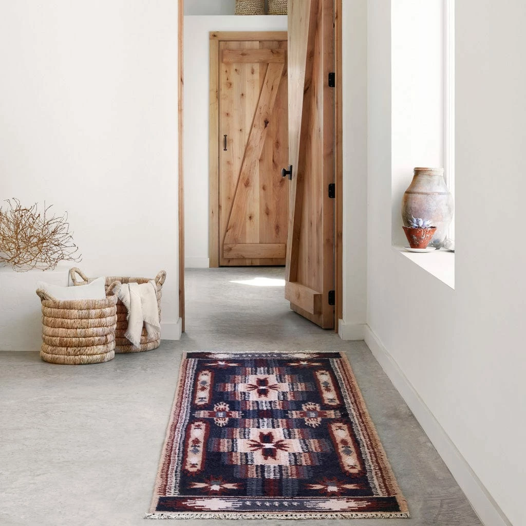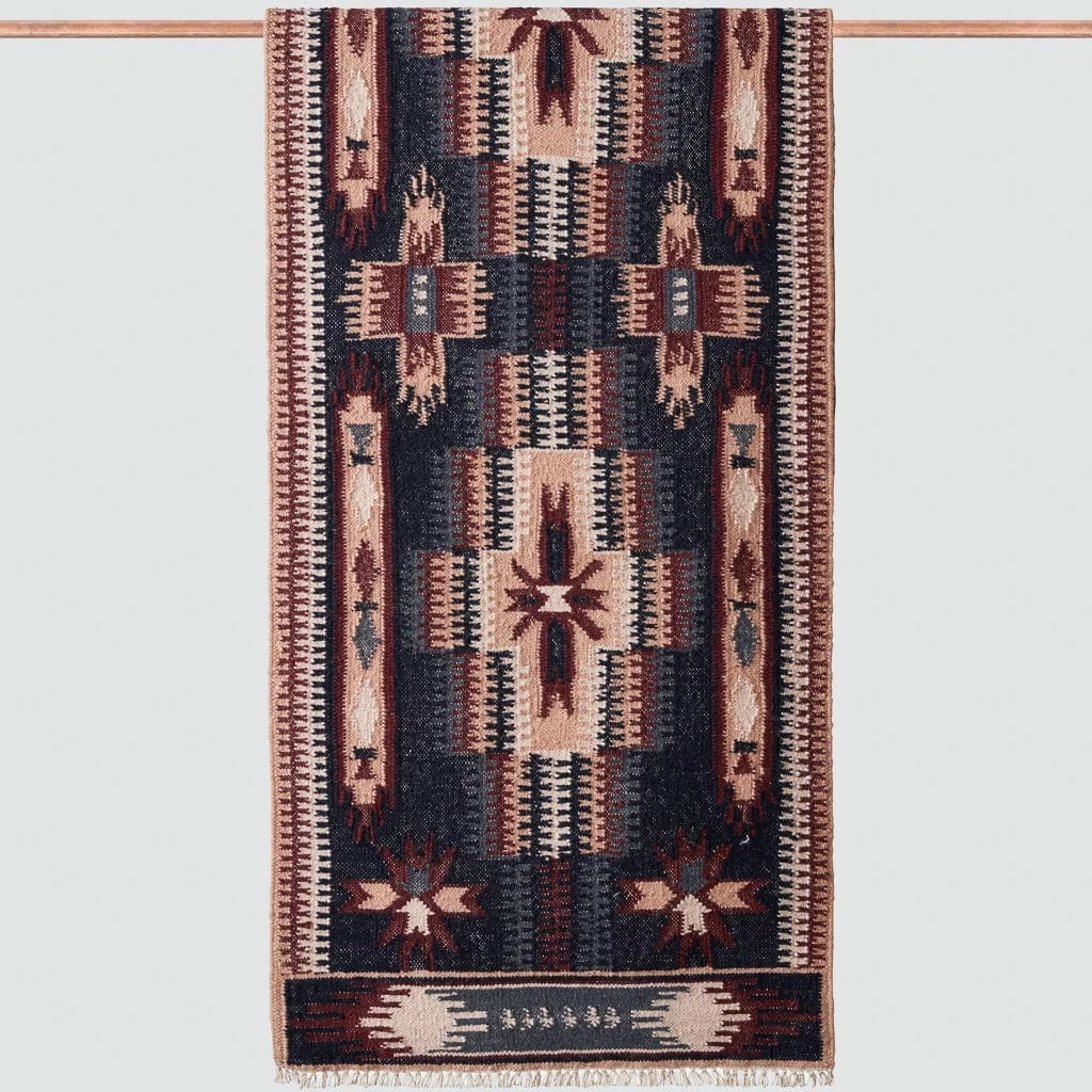 Traditional Indian motifs in a rich palette of navy, blush, maroon, and subtle pops of peach, this show-stopping runner is a work of art. Meticulously handwoven from the highest quality sheep’s wool, this woven masterpiece is as durable as it is stunning.