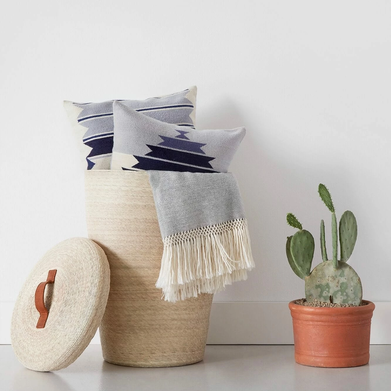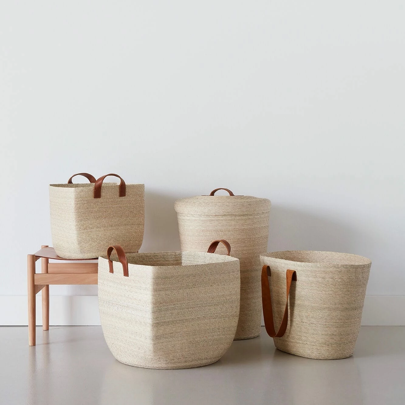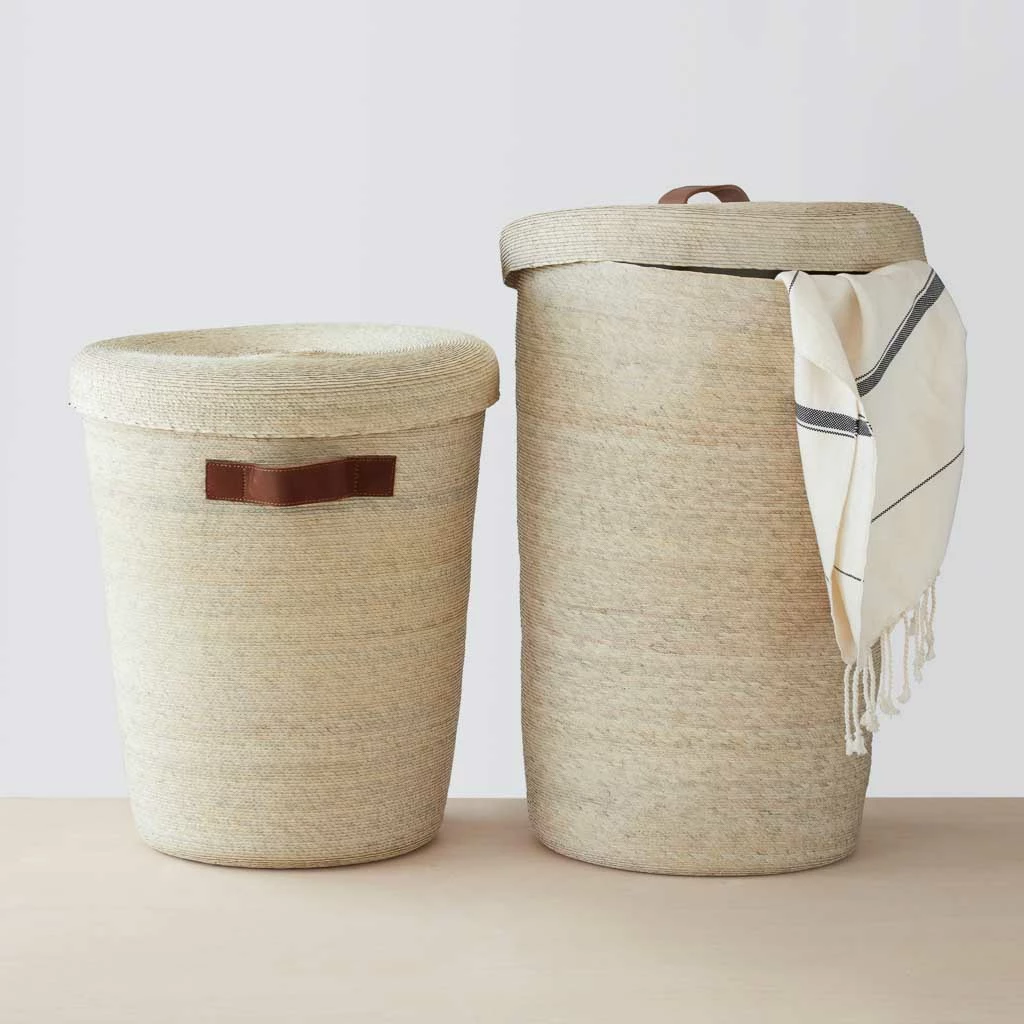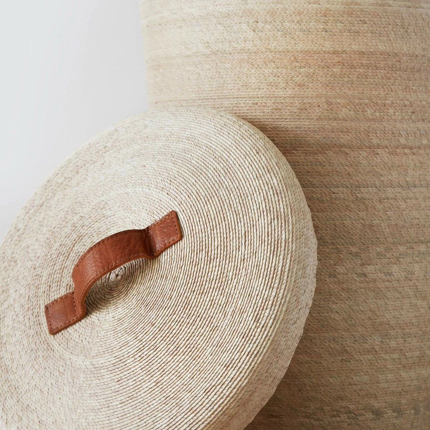 Meticulously handcrafted from locally-sourced palm leaves, this oversized storage basket is the ideal stash-everything catch-all. Topped with a fitted lid and luxe leather handle, it makes a stylish hiding spot for all sorts of clutter – laundry, towels, toys, you name it.