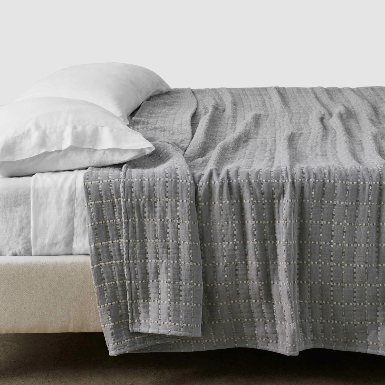 Loomed with 100% cotton, this lightweight, quilted bed blanket is where comfort meets style. Crafted with tonal stitched lines, each blanket features a modern grid design that is truly timeless. And bonus, these beauties are machine washable, making it the ultimate bedding essential.