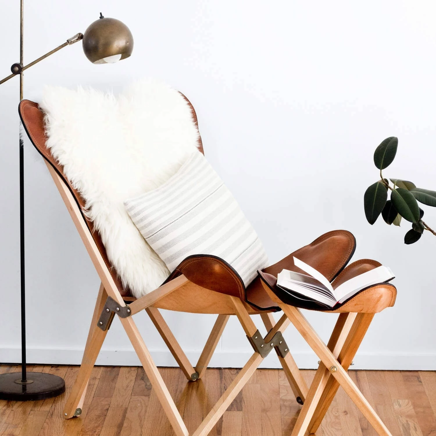 The supporting frame is hand-carved from high quality guindo wood, a lightweight but incredibly durable timber, and assembled with brass hardware. It folds up into a matchstick profile, making it great to take on adventures or move around as an extra seat in small apartments.