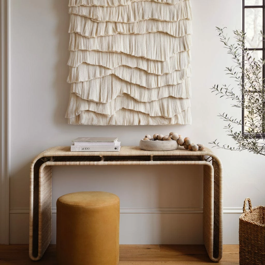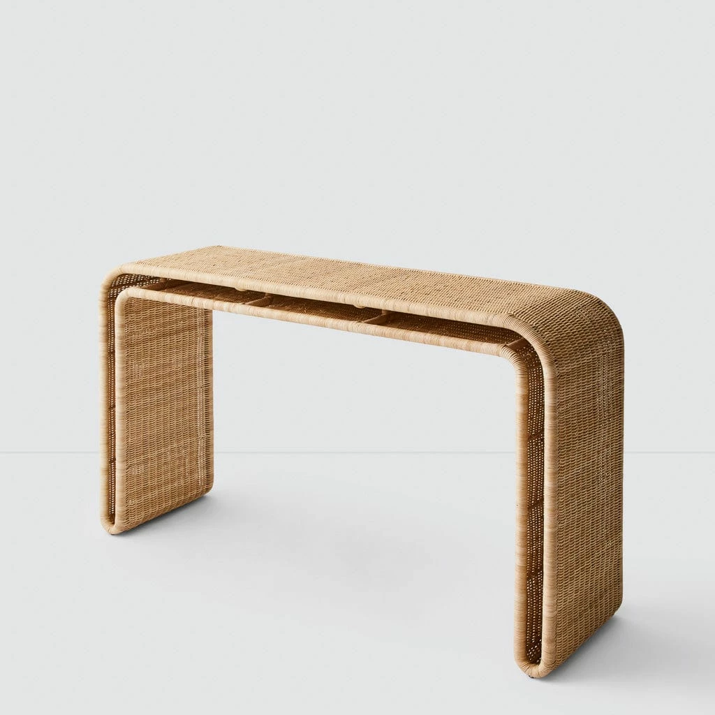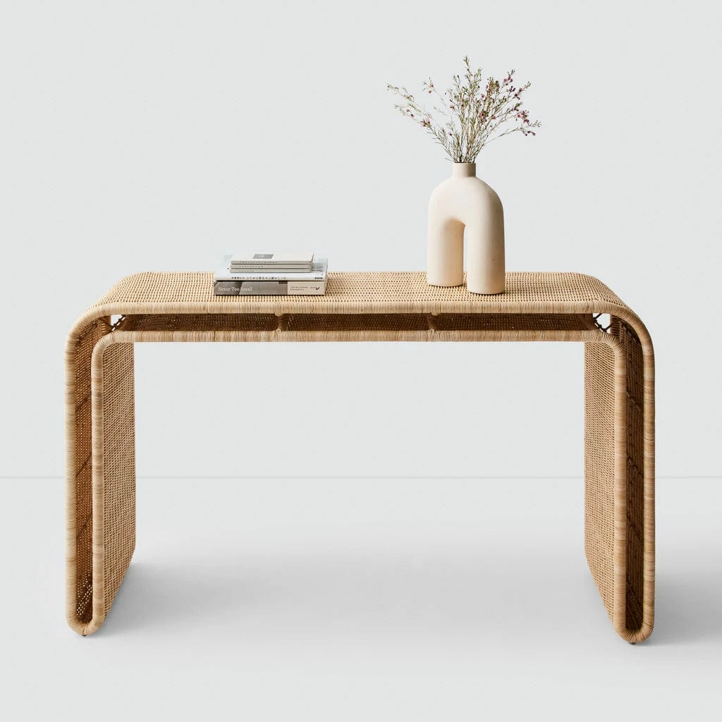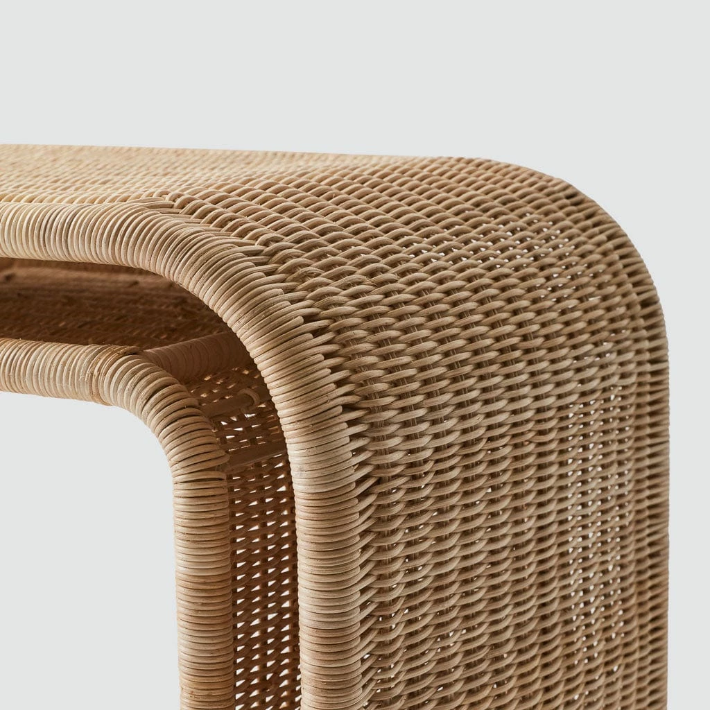 Effortlessly warm. Naturally stunning. Locally-sourced rattan is woven together to form the clean, sculptural frame of this modern console table. A statement piece in any space, it’s perfectly placed in your entryway or just behind the sofa.