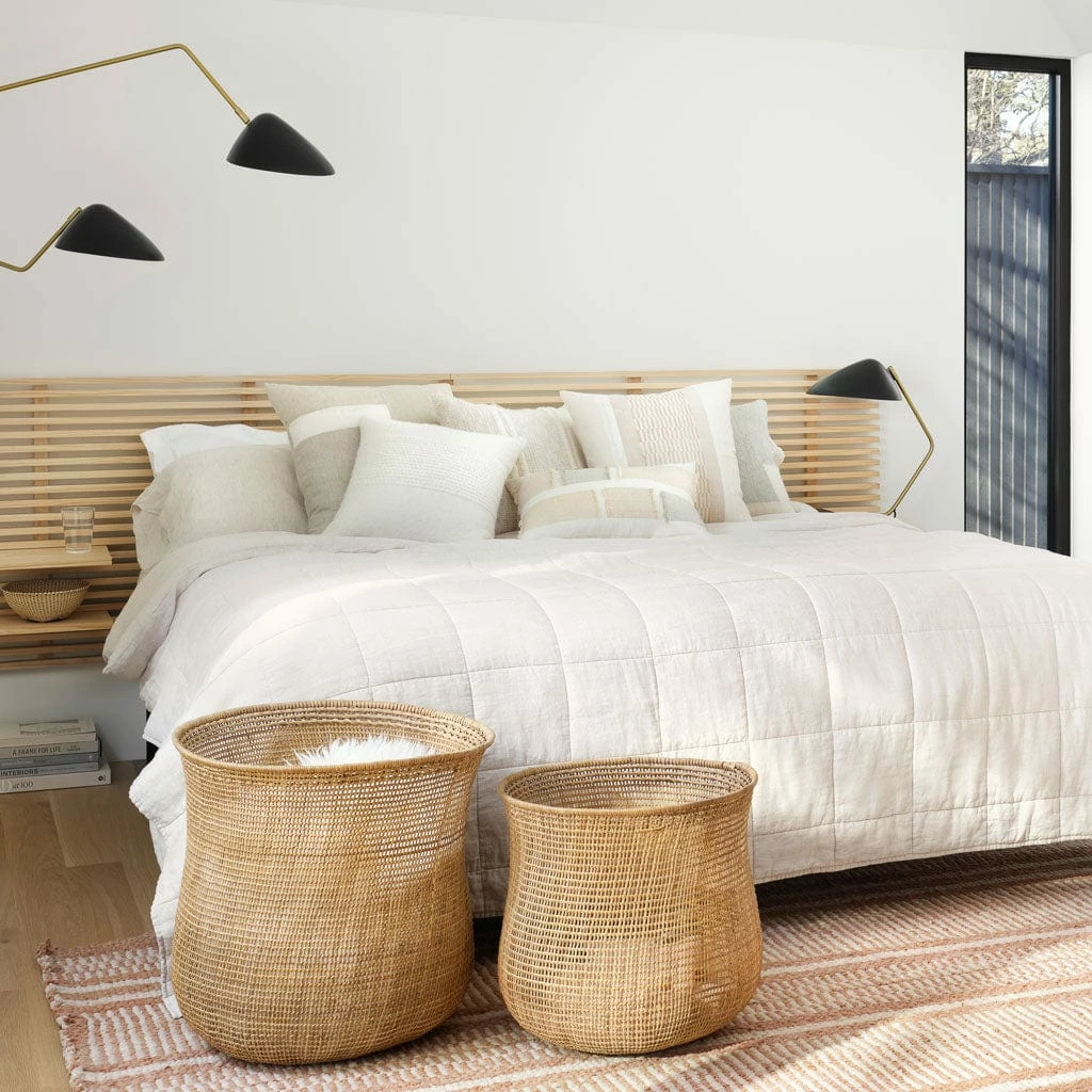 Every styling situation craves a good anchor. Well, look no further. This beautiful linen pillow works perfectly on a couch or in lieu of traditional Euro pillows on a bed. It’s simple and neutral but with quite a bit of interest – with striking color blocking balanced by a soft, neutral color combo.