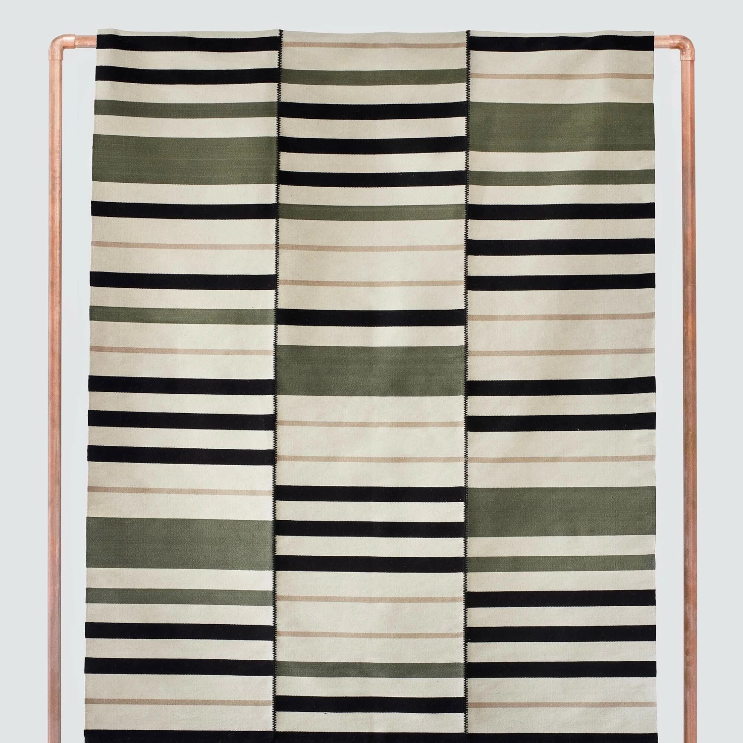 With an earthy palette of cream, olive, black and tan hues, this area rug brings a natural, laid-back feel to your space. Master weavers add a luxe layer of hand-stitched detailing to connect every panel, adding an element of interest to this graphic design.