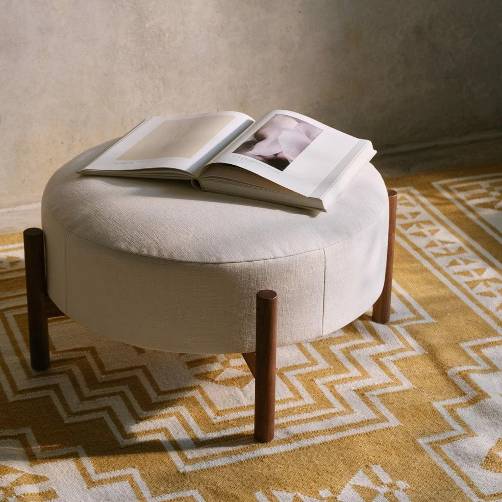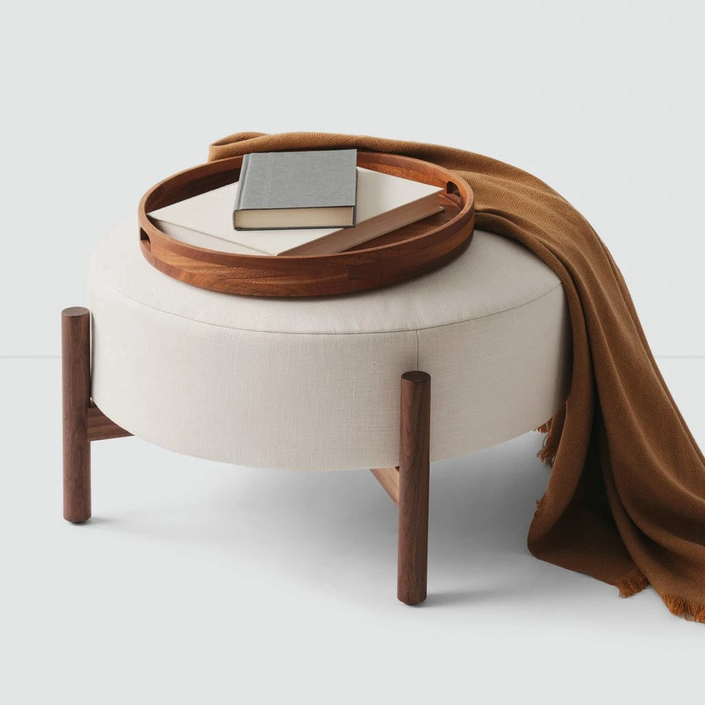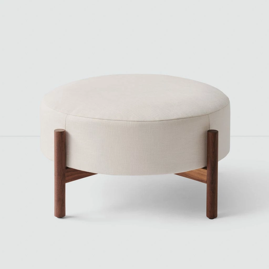 Whether styled as a bit of extra seating or just a place to rest your feet, this versatile round ottoman adds a luxe, modern accent to any space. Available in rich leather and crisp linen, each piece is crafted with a sturdy, lightweight frame of ash or walnut.
