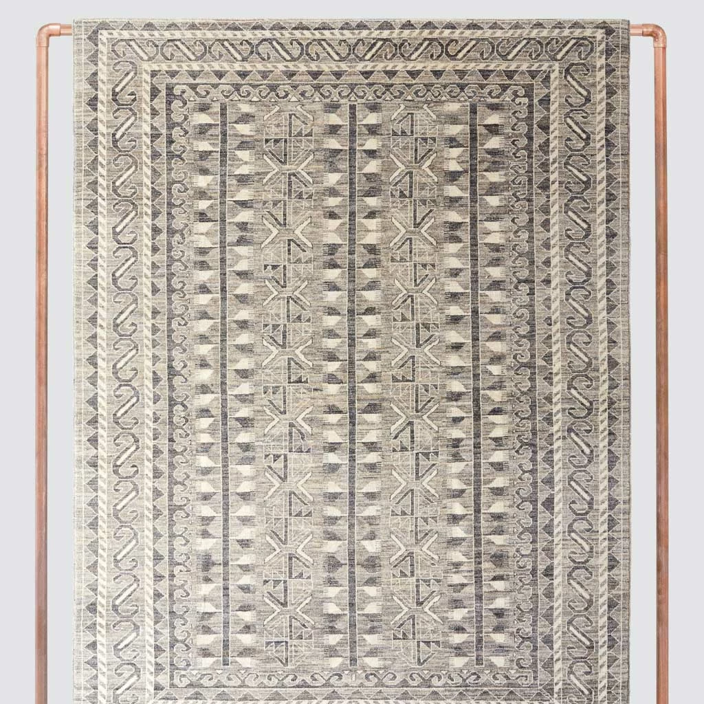 Simplicity is never short on style. Layers of craftsmanship are knotted by hand into this beautiful Afghan rug. A rich blend of geometric shapes, each rug features eye-catching patterns of arrows and triangles. Available in a natural shade of charcoal, this rug is a minimal masterpiece.
