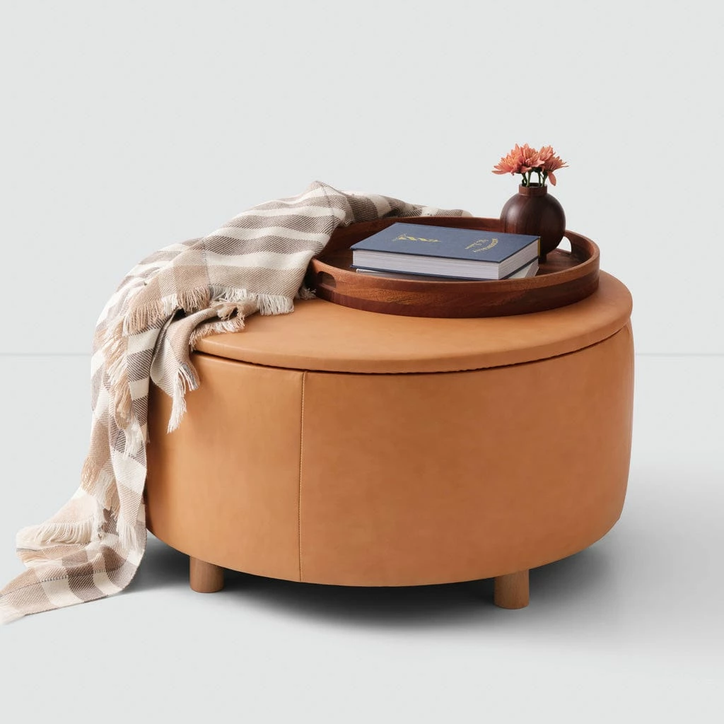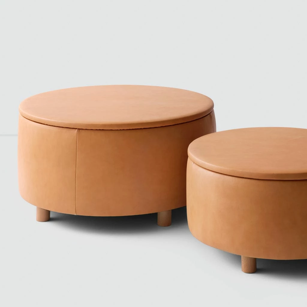 Seamlessly blurring the line between form and function, this leather storage ottoman makes for a handsome addition to any living area or bedroom. With a detachable lid and ample storage space, it conveniently stashes any toys, books, or blankets. Featuring buttery-soft leather and hand-stitched detailing, this ottoman can make a statement on its own or as a set of two.